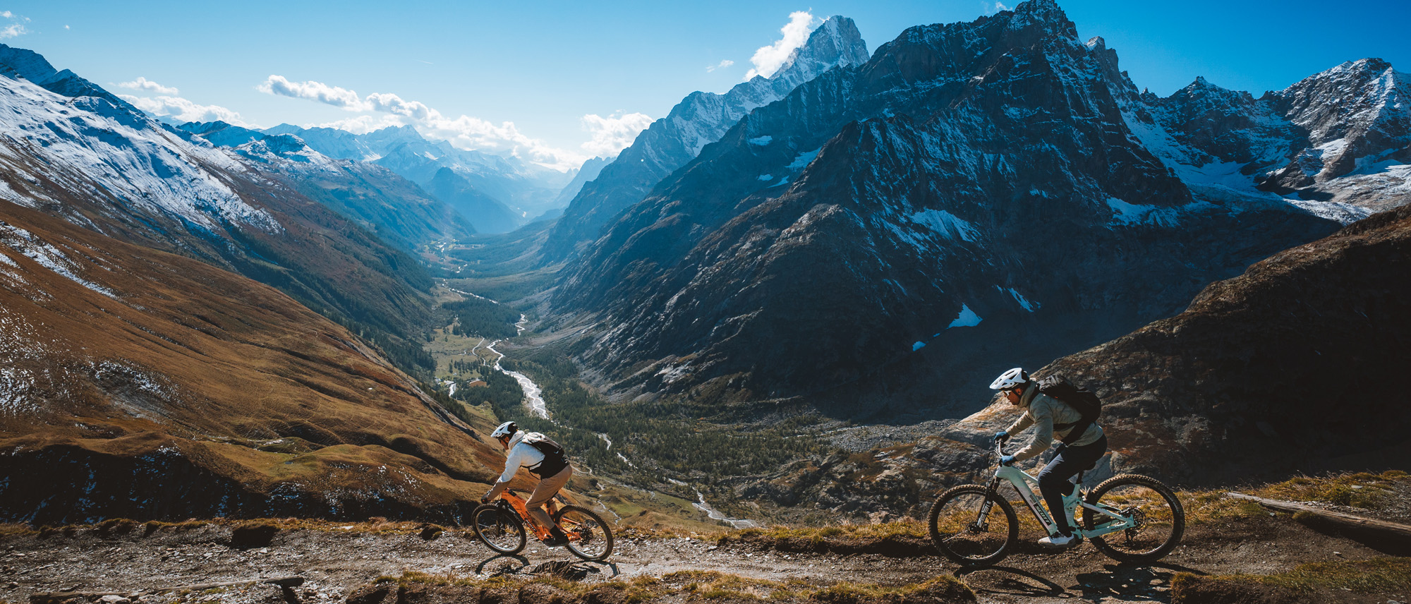 L’idée de parcourir le Tour du Mont Blanc en quatre jours est venue de mon pote Massimo, plus connu sous le nom de « Bubba ». Un parcours effectué dans le sens des aiguilles d’une montre autour du géant blanc, à la recherche des plus beaux trails pour VTT électrique. À la fin de la saison, lorsque les randonneurs sont partis, que les refuges sont fermés, et que nous avons enfin du temps pour nous. Bubba et moi sommes guides de VTT en été, et nous emmenons souvent nos clients sur cette itinéraire. Mais aujourd’hui, la montagne est à nous seuls.